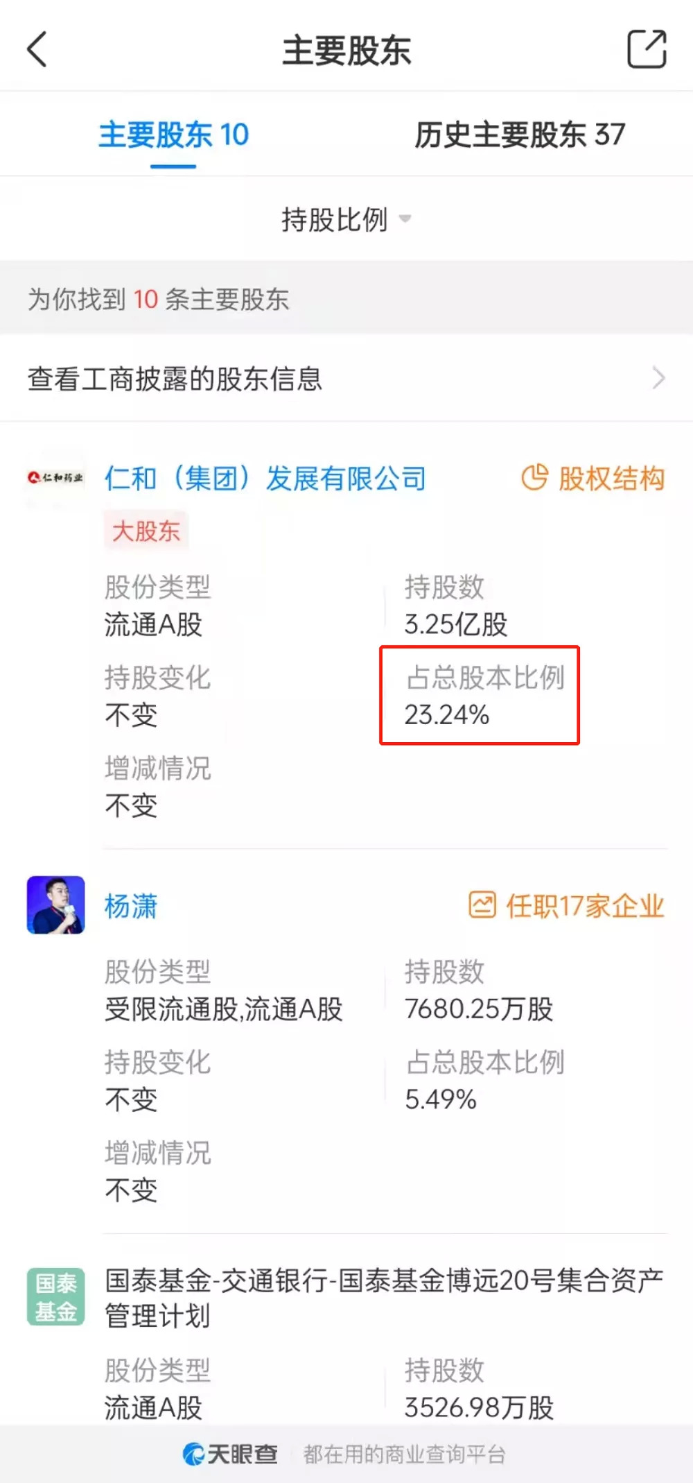 此外,天眼查显示,上市药企仁和药业的第一大股东就是仁和集团,持股比例高达26.27%。因此,“仁和集团”、“仁和药业”、“药都仁和”、“法兰仁和”、“仁和匠心”之间的关系可以简单梳理为:仁和药业为仁和集团的控股子公司,而“药都仁和”、“法兰仁和”、与“仁和匠心”为仁和集团所持有的商标。