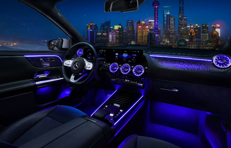 再搭配上奔驰的“杀手锏”64色氛围灯,车外大厦耸立,车内气氛色彩旖旎,氛围值直接拉满。