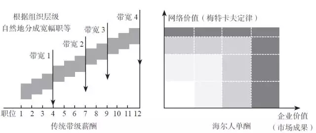 由此,海尔完全舍弃被传统企业广为使用的“宽带薪酬”(图11-1),代替以“海尔人单酬”,形成超利分享机制。海尔的超利分享表是一个二维点阵,横轴还是传统的效能指标,纵轴是与用户交互价值的指标。按照海尔自己的讲法,横轴是企业价值,纵轴便是网络价值。海尔舍弃掉“宽带薪酬”体制,其实是把原先按业绩达标情况考评的体系给压平了,压成了横轴。而纵轴完全是海尔自创的,这个纵轴的理论溯源是梅特卡夫定律。简单说,纵轴就是海尔员工与用户的交互指数,这个指数由用户数、交互次数、交互质量等综合而来。
