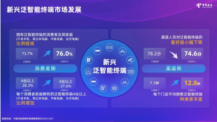 从数据可以看出,到2022年,泛终端与手机的占比基本对半分。这点从终端技术论坛上,中国电信研究院评测中心副主任程贵锋发布的《2021版第二期中国电信终端洞察报告》(以下简称《洞察报告》)也能初见端倪。《洞察报告》显示,拥有泛智能终端的家庭比例从2020年的73.7%上升至76%,家庭拥有4台以上泛终端的比例也从去年的28.3%上升至37.6%。