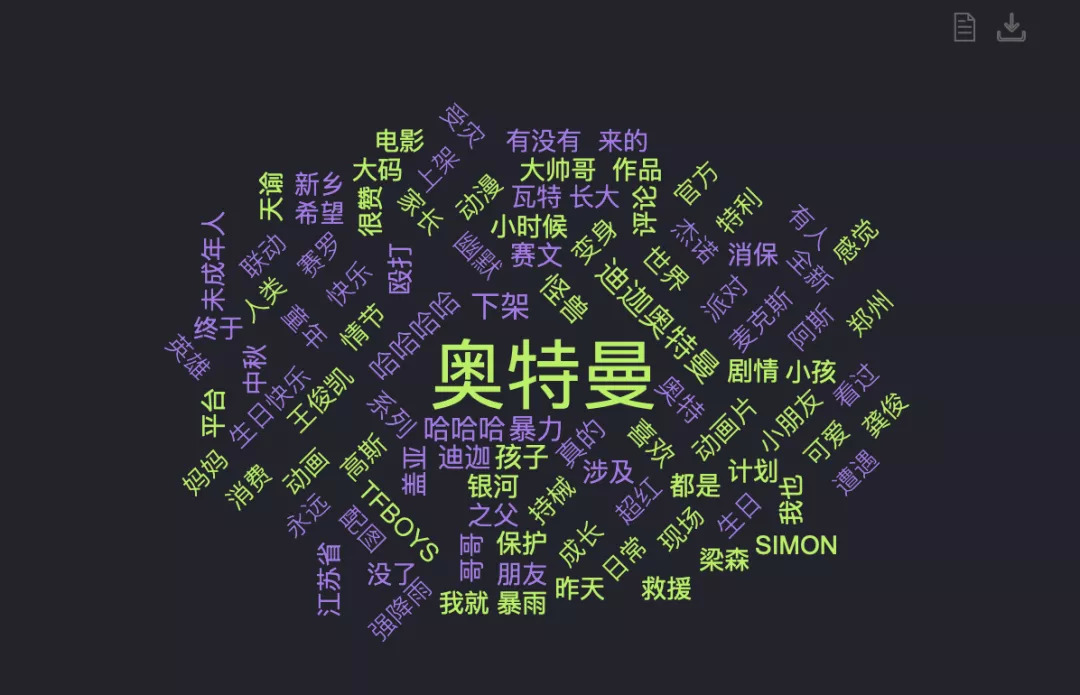 从关键词来看,在数据周期内讨论奥特曼的关键词以“下架、暴力、孩子、怪兽”等为主,可以看到,宇宙之光顶流的话题热度是新闻事件,主要原因是由于《迪迦奥特曼》被下架的新闻,引起了一波讨论。