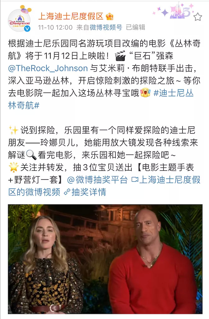 当然,官方蹭流量也不是第一次了,在此之前,「儿儿」还为《丛林奇航》“站台宣传”引流,宣传的还是巨石强森的电影。