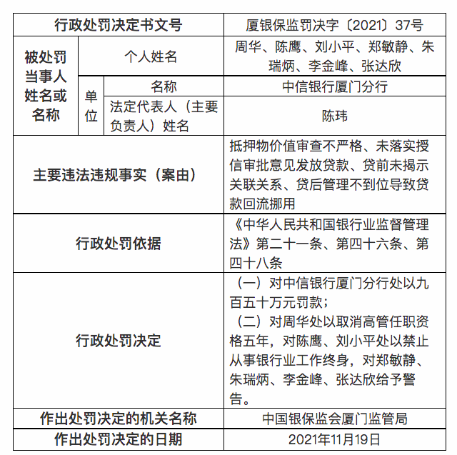 银保监会厦门监管局对中信银行厦门分行罚款950万元,同时,对周华作出取消高管任职资格五年的处罚,对陈鹰、刘小平作出禁止从事银行业工作终身的处罚,对郑敏静、朱瑞炳、李金峰、张达欣给予警告。