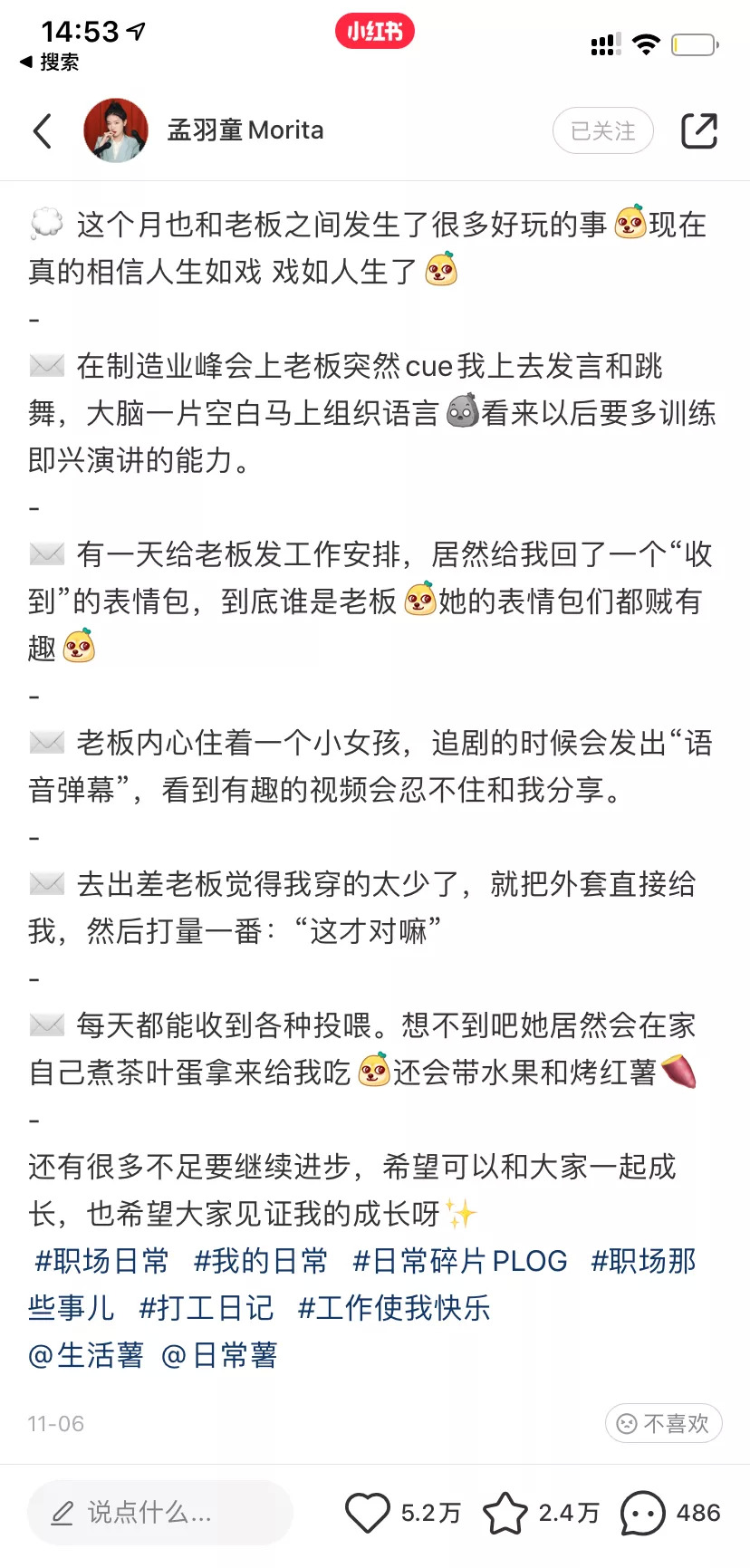 孟羽童入职后在小红书上的分享,主要聚焦职场穿搭、职场工作小技巧、陪同出差、参加论坛、媒体采访等方面,没有涉及所谓的核心业务,但活脱脱成了格力的新品牌代言人。