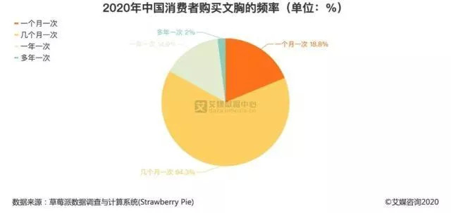 此外,内衣作为刚需,其购买频次也相对较高。相关数据显示,2020年中国64.3%的消费者几个月购买一次文胸,比例最大;18.8%的消费者一个月购买一次文胸;14.9%的消费者一年购买一次文胸;仅有2%的消费者多年购买一次文胸。
