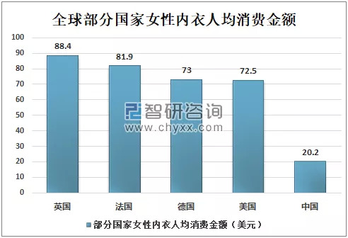 这也意味着中国女性内衣市场则潜力巨大:与发达国家对比可知,英国女性内衣消费支出最高为88.4美元,其次是法国女性为81.9美元,而中国女性的内衣消费支出仅为20.2美元。