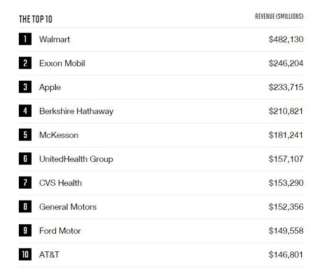 《财富》杂志根据上一财年的总营收对各美国公司进行了排名。在周一公布的榜单里,沃尔玛以超过4821亿美元的总营收位居榜首;其次是埃克森美孚的2462亿美元。