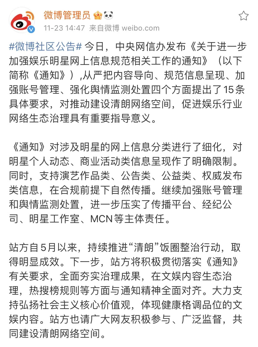 11月23日,国家网信办印发《关于进一步加强娱乐明星网上信息规范相关工作的通知》(下文简称《通知》),对网站平台首页首屏、热搜榜单、热门推荐等环节的娱乐明星信息呈现提出明确要求,包括对明星个人动态和商业活动进行限制、严格明星经纪公司和粉丝团账号管理、同一明星同一时段原则上只能呈现一条等。