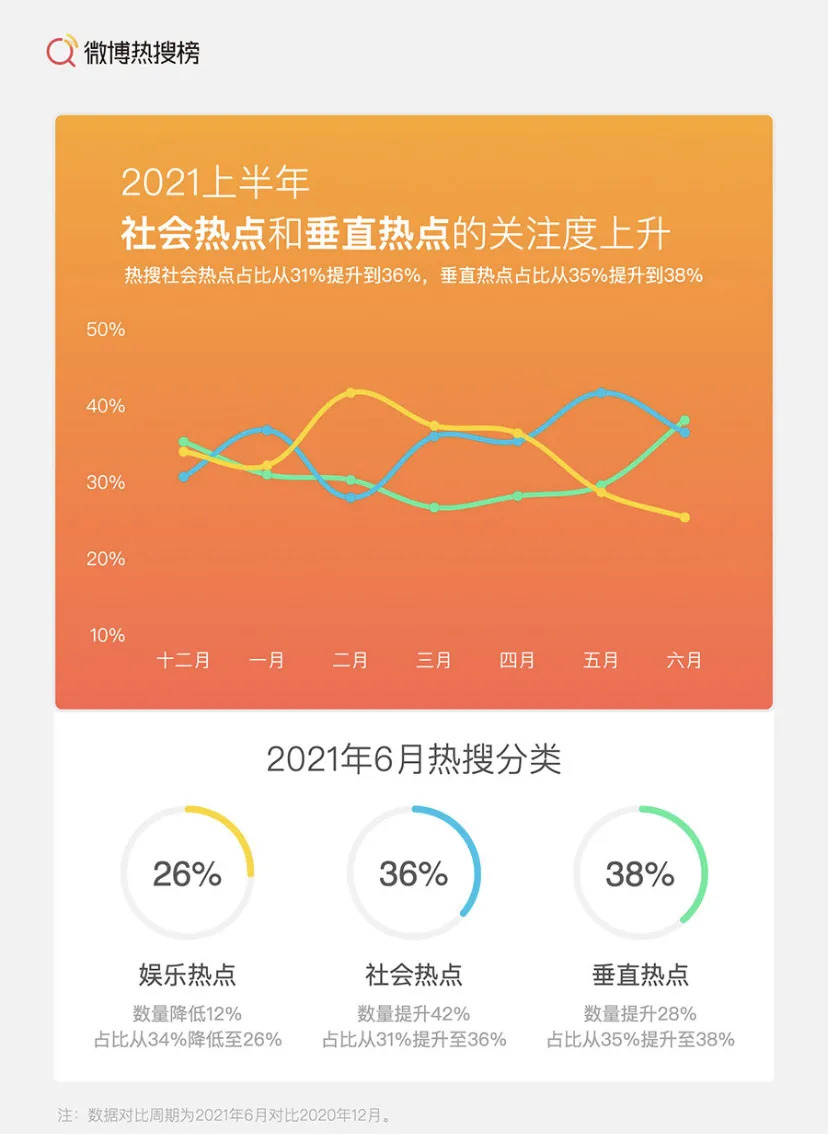 微博8月发布的《微博热搜榜趋势报告》显示,2021上半年,热搜社会热点和垂直热点占比大幅提升,娱乐热点占比从34%下降到26%。