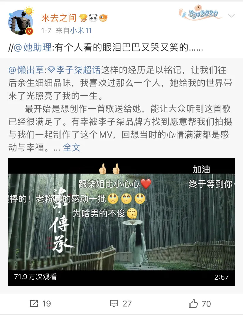于是乎我们看到,在王高飞@来去之间频繁推荐李子柒视频的同时,新浪微博于2018、2020年两次参与了对李子柒所在的杭州微念的投资。天眼查显示,目前新浪微博合计大概持有杭州微念11.1649%的最终收益股份,是杭州微念直接股东当中的第三大股东。