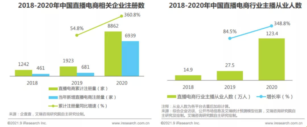 据第三方机构艾瑞咨询发布的《2021年中国直播电商行业研究报告》显示,截至2020年底,中国直播电商相关企业累计注册8862家,行业内主播从业人数已经达到123.4万人——再加上偶尔直播的明星名人以及陆续加入其中的主播,这个数量应该会更庞大。