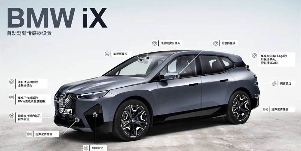 iX前挡风玻璃处使用了1个800万像素的前视高清摄像头,1个增强现实前视摄像头,还有前后左右共四个环视摄像头。