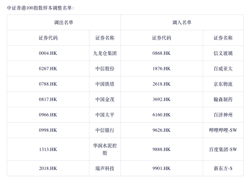 11月26日晚间,中证指数有限公司网站发布公告称,根据指数规则,经指数专家委员会审议,中证指数有限公司决定调整沪深300、中证500、中证香港100等指数样本,自2021年12月10日收市后生效。其中沪深300指数更换28只样本,中证500指数更换50只样本,中证香港100指数更换8只样本。