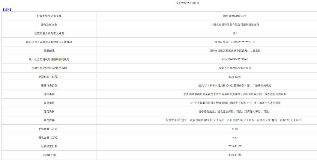 深外管检[2021]45号行政处罚决定文书显示,农业银行深圳福田支行因存在在办理经常项目资金收付未对交易单证的真实性及其与外汇收支的一致性进行合理审查,违反了《中华人民共和国外汇管理条例》第十二条的相关规定,国家外汇管理局深圳市分局决定责令该行改正,没收违法所得9.89万元人民币,处以罚款55万元人民币,对责任人区某警告,罚款12万元人民币。