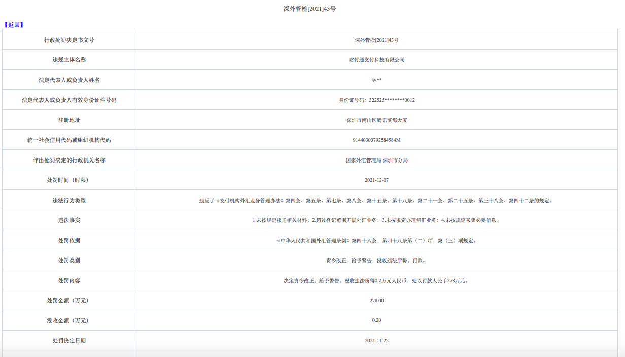 深外管检[2021]43号行政处罚决定文书显示,财付通因存在未按规定报送相关材料,超过登记范围开展外汇业务,未按规定办理售汇业务,未按规定采集必要信息等行为,违反了《支付机构外汇业务管理办法》第四条、第五条、第七条、第八条、第十五条、第十八条、第二十一条、第二十五条、第三十八条、第四十二条的规定。