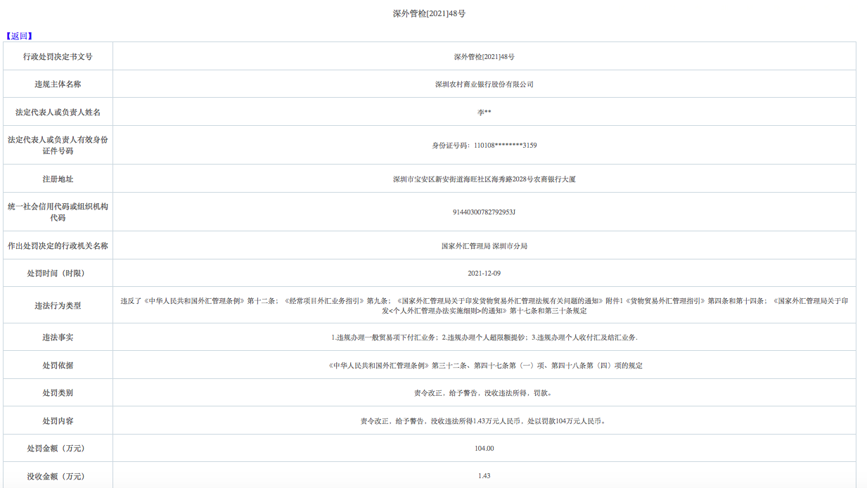 深外管检[2021]48号行政处罚决定文书显示,深圳农商行因存在违规办理一般贸易项下付汇业务,违规办理个人超限额提钞,违规办理个人收付汇及结汇业务,违反了《中华人民共和国外汇管理条例》第十二条,《经常项目外汇业务指引》第九条,《国家外汇管理局关于印发货物贸易外汇管理法规有关问题的通知》附件1《货物贸易外汇管理指引》第四条和第十四条,《国家外汇管理局关于印发<个人外汇管理办法实施细则>的通知》第十七条和第三十条规定。