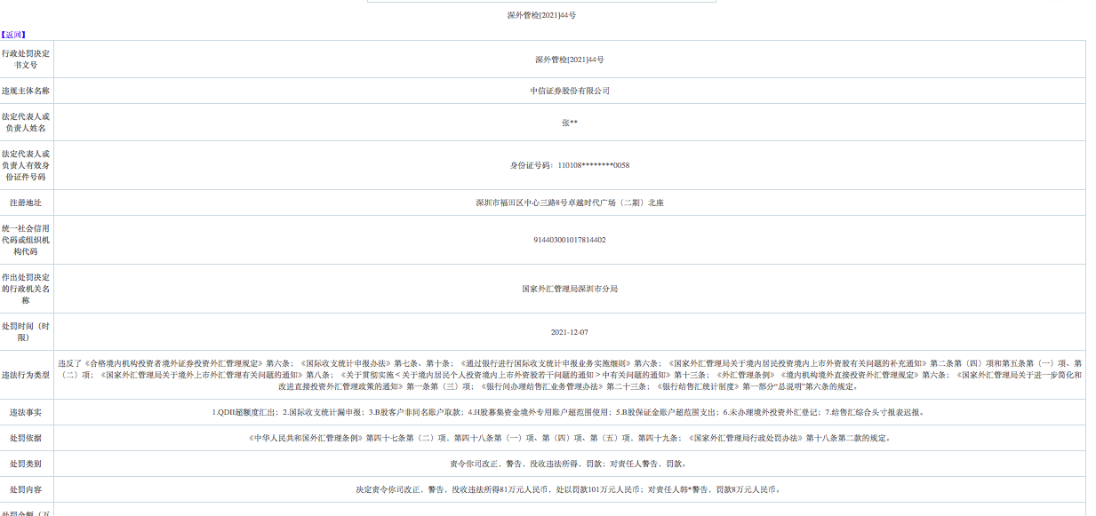 深外管检[2021]44号行政处罚决定文书显示,中信证券因存在QDII超额度汇出,国际收支统计漏申报,B股客户非同名账户取款,H股募集资金境外专用账户超范围使用,B股保证金账户超范围支出,未办理境外投资外汇登记,结售汇综合头寸报表迟报,违反了《合格境内机构投资者境外证券投资外汇管理规定》第六条,《国际收支统计申报办法》第七条、第十条,《通过银行进行国际收支统计申报业务实施细则》第六条,《国家外汇管理局关于境内居民投资境内上市外资股有关问题的补充通知》第二条第(四)项和第五条第(一)项、第(二)项,《国家外汇管理局关于境外上市外汇管理有关问题的通知》第八条,《关于贯彻实施<关于境内居民个人投资境内上市外资股若干问题的通知>中有关问题的通知》第十三条,《外汇管理条例》《境内机构境外直接投资外汇管理规定》第六条,《国家外汇管理局关于进一步简化和改进直接投资外汇管理政策的通知》第一条第(三)项,《银行间办理结售汇业务管理办法》第二十三条,《银行结售汇统计制度》第一部分“总说明”第六条的规定。