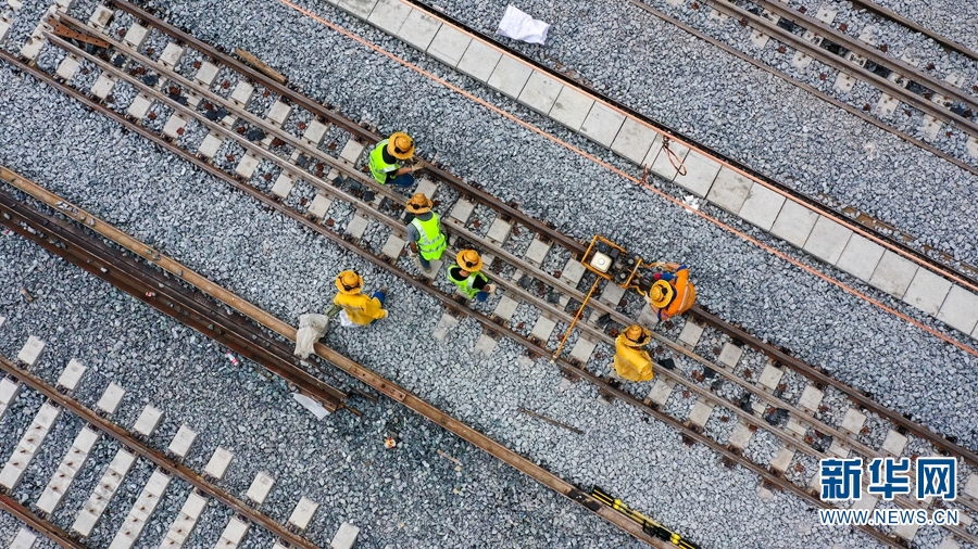 中老铁路勐松二号隧道附近,铁路建设者正在进行轨道精调(摄于10月27日)。(新华网 赵普凡 摄)