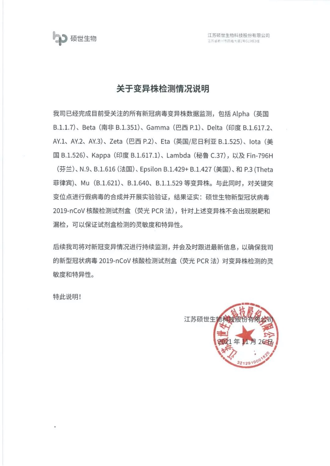 在此前的11月27日,硕世生物(688399.SH)也在其官方公众号上发布一篇“迄今为止进化最多的变种病毒Omicron!硕世生物新冠检测试剂可有效检出,不脱靶、不漏检”的文章。内容提及,目前硕世生物已经完成目前所有新冠病毒变异株的数据监测,包括Alpha(英国B.1.1.7)、Beta(南非B.1.351)、Gamma(巴西P.1)、Delta(印度B.1.617.2、AY.1、AY.2、AY.3)、Zeta(巴西P.2)、Eta(英国/尼日利亚B.1.525)、Iota(美国B.1.526)、Kappa(印度B.1.617.1)、Lambda(秘鲁C.37)及Fin-796H(芬兰)、N.9、B.1.616(法国)、Epsilon B.1.429+ B.1.427(美国)、和P.3 (Theta菲律宾)、Mu(B.1.621)、B.1.640、B.1.1.529等变异株。对关键突变位点进行假病毒合成并开展实验验证的结果证实,硕世生物新型冠状病毒2019-nCoV核酸检测试剂盒(荧光PCR法),针对上述变异株均不会出现脱靶和漏检,可有效保证检测特异性、准确性与灵敏度。硕世生物还表示后续将及时跟进最新信息,以确保公司新型冠状病毒2019-nCoV核酸检测试剂盒(荧光PCR法)对变异株检测的灵敏度和特异性。