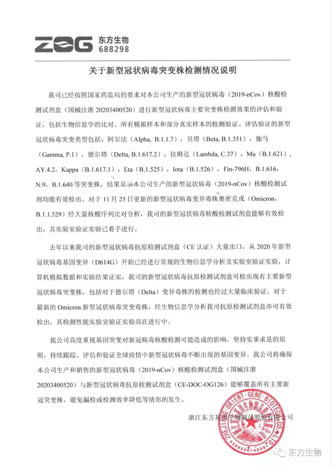 据东方生物进一步描述,去年以来该公司的新型冠状病毒抗原检测试剂盒(CE认证)大量出口,从2020年新型冠状病毒基因变异(D614G)开始已经进行常规的生物信息学分析及实验室验证实验,计算机模拟数据和实验结果证实,公司的新型冠状病毒抗原检测试剂盒可检出现有主要新型冠状病毒突变株,包括对于德尔塔(Delta)变异毒株的检测也经过大量临床验证。对于最新的Omicron新型冠状病毒突变毒株,经生物信息学分析公司抗原检测试剂盒也可有效检出,其检测性能实验室验证实验尚在进行中。东方生物进一步称,公司将确保生产和销售的新型冠状病毒(2019-nCov)核酸检测试剂盒与新型冠状病毒抗原检测试剂盒(CE-DOC-OG126)能够覆盖所有主要新冠突变株,避免漏检或检测效率降低等情形的发生。