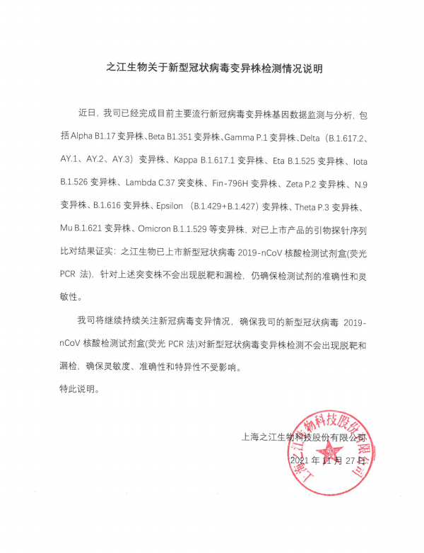 之江生物(688317.SH)在周日也有发布称,针对病毒变异株最新动态,之江生物第一时间进行基因数据监测与分析。之江生物已上市的新型冠状病毒2019-nCoV核酸检测试剂盒(荧光PCR法),是针对病毒的ORF1ab、N、E三个靶基因进行特征性识别检测,与目前流行的变异株(包括但不限于Alpha、Beta、Gamma、Delta、Kappa、Eta、Iota、Lambda以及Omicron等)均进行了生物信息分析和对比验证,结果证实:之江生物已上市新型冠状病毒2019-nCoV核酸检测试剂盒(荧光PCR法),不会出现脱靶和漏检的情况。后续,之江生物将持续紧密追踪全球新冠病毒变异株的最新动态,确保检测试剂的准确性和灵敏性。
