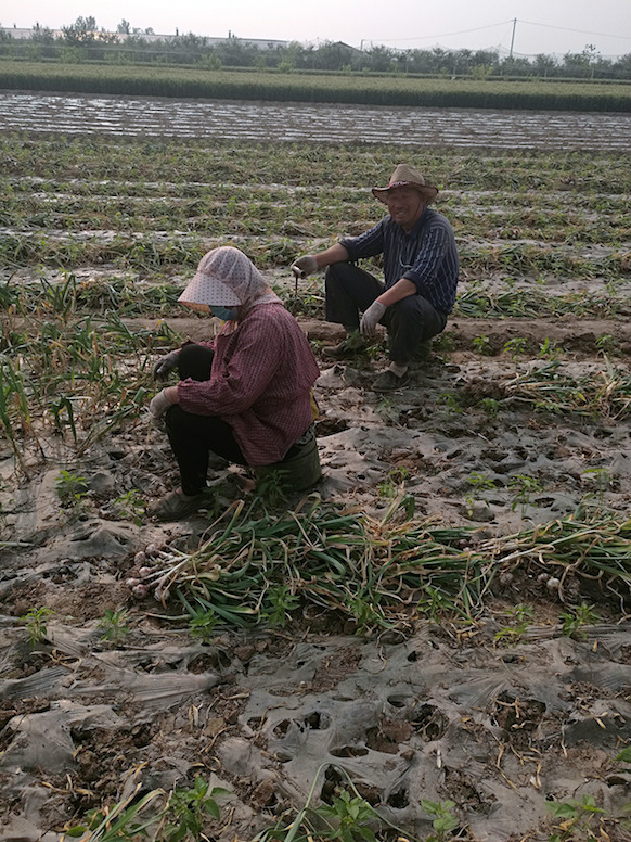 5月12日,金乡县鱼山镇苏楼村,年过七旬的蒜农周春喜正在跟老伴在田里收割自家的大蒜。他们有一对儿女在外打工,多年以来,老两口就靠打理这两亩见方的蒜田养家糊口。
