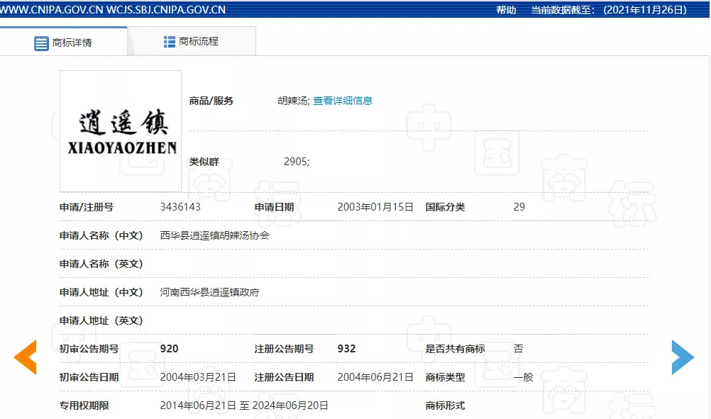 11月26日,国家知识产权局对此事做出回应,从法律上,“逍遥镇”作为普通商标,其注册人不能据此收取所谓的“会费”。并且,国家知识产权局还表示,逍遥镇胡辣汤协会有效注册“逍遥镇”商标3件,分别注册于2004年6月21日、2008年2月28日和2009年4月7日,其中,前两次由个人注册,后逍遥镇胡辣汤协会通过商标转让取得该商标专用权。