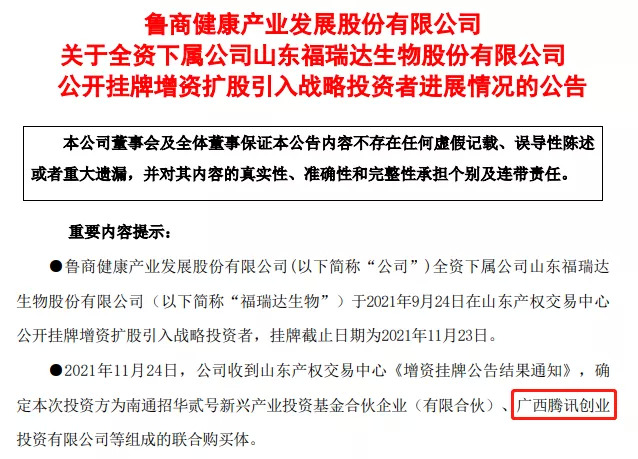 先是11月24日,上市企业鲁商发展发布公告,旗下全资子公司福瑞达生物引入5家战略投资者,分别为南通招华贰号新兴产业投资基金合伙企业(有限合伙)、广西腾讯创业投资有限公司、杭州众达源企业管理合伙企业(有限合伙)、济南动能嘉福投资合伙企业(有限合伙)和上海众源二号私募投资基金合伙企业(有限合伙)。