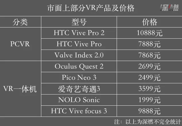据深燃不完全统计,HTC Vive Pro 2、HTC Vive Pro、Valve Index是当前市面常见的几款PCVR产品。一些侧重游戏体验、稳定性的高端玩家会选择PCVR。但由于需要连接电脑,对电脑配置也有一定要求,因此并非大多数C端用户的首选。