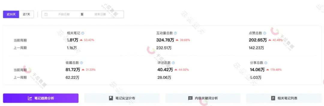 据千瓜数据显示,在腰部红人和素人“自来水”的种草推荐下,LAN蘭近三十天相关笔记量高达1.81万,同比增长53.43%,互动量高达324.78万,同比增长39.68%,评论总数达40.42万,同比增长44.02%,数据可观且增长迅猛。