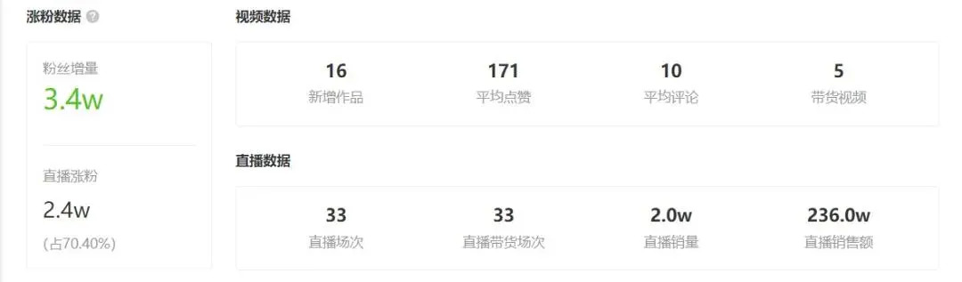 而在抖音平台,LAN蘭近三十天粉丝增量达3.4万,其中70.66%为直播增粉,33场直播带货共计售出2.0万件商品,销售额达236.0万,同样不容小觑。