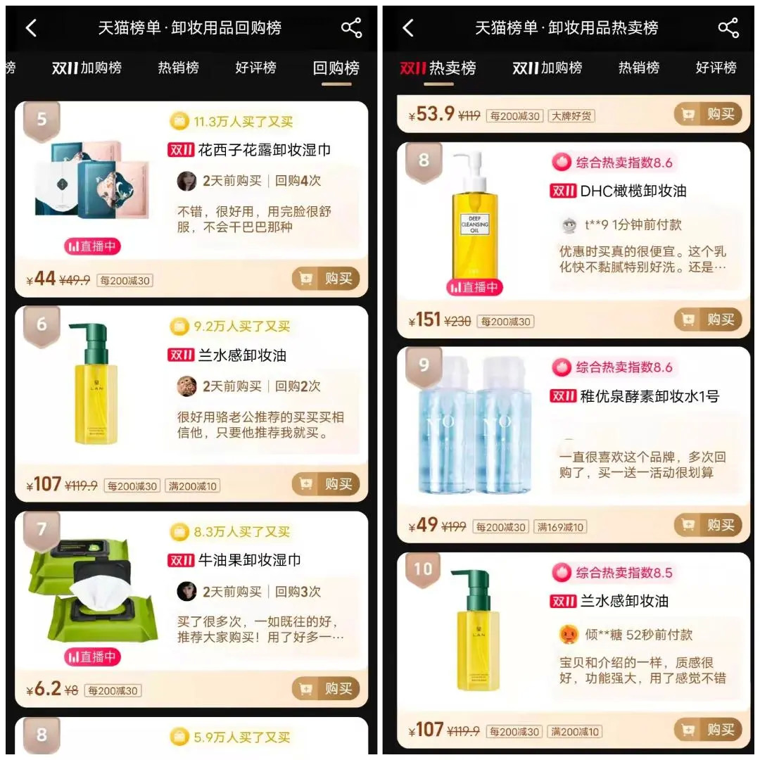 在2021年双十一活动期内,LAN蘭旗下明星单品水感卸妆油位居天猫回购榜TOP6,热销榜TOP11,月销4W+,且大有上升趋势,展现出以点破面的新锐力量。