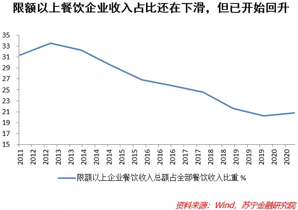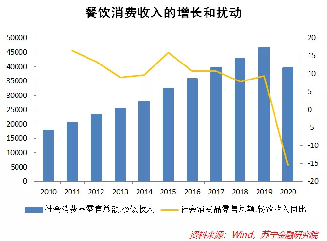 消费升级和服务业的发展,使得餐饮行业的发展空间巨大。餐饮业消费总额在2019年就达到了4.67万亿元。随着城市化进程深化,城市化带来的社会分工和服务业的扩张,将催生更多的餐饮服务需求。疫情以来对餐饮业的冲击极大,2020年餐饮行业总收入降到了3.95万亿元,并且这一影响很可能随着疫情的继续演化而持续下去。但长期看,餐饮行业的发展空间依然较大。中国人民吃出来的万亿赛道,不可能因为疫情受到长期的压制。