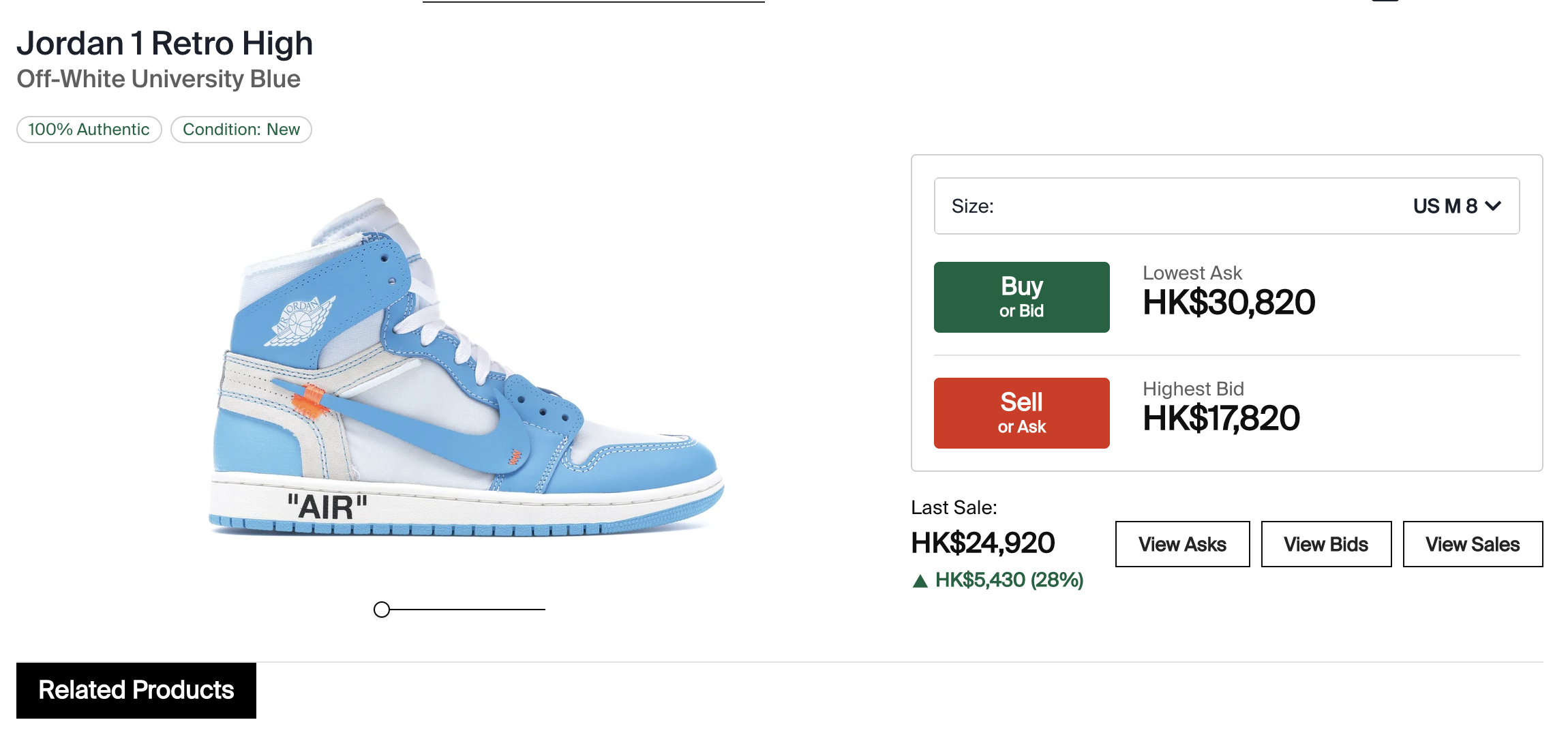 Off-White与Air Jordan合作款的售价也在StockX上出现了不同程度的上涨。大量消费者涌入抢购8码的Jordan 1 Retro High球鞋,还未到中午,29日当天就已经有超过15笔交易,售价涨幅被推升28%。此前,该球鞋的8码款式通常是每隔两天或三天才卖出一双。