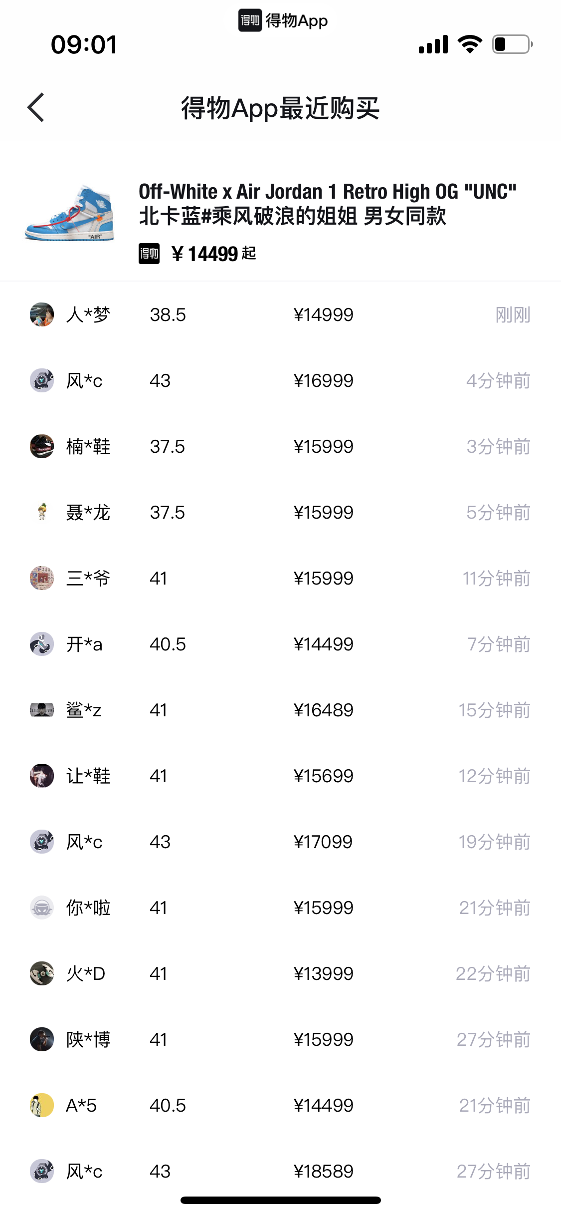 类似情况在中国本土的转卖平台上也有出现。在得物App上,Jordan 1 Retro High同样受到消费者欢迎,红色款和白色款的最低价分别为52999元和32999元,蓝色款则为14999元。从购买记录来看,大部分消费者是在29日早晨得知Virgil Abloh逝世的消息后,才涌入进行购买,并且购买频率间隔从最初的1分小时变为5分钟、6分钟。