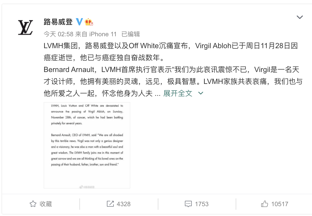 北京时间11月29日凌晨,法国奢侈品牌Louis Vuitton路易威登在官方微博发布声明,确认男装艺术总监Virgil Abloh逝世的消息,享年41岁。Virgil Abloh的另一重身份则是潮流品牌Off-White的创始人兼设计师,他在逝世前已与癌症斗争数年。