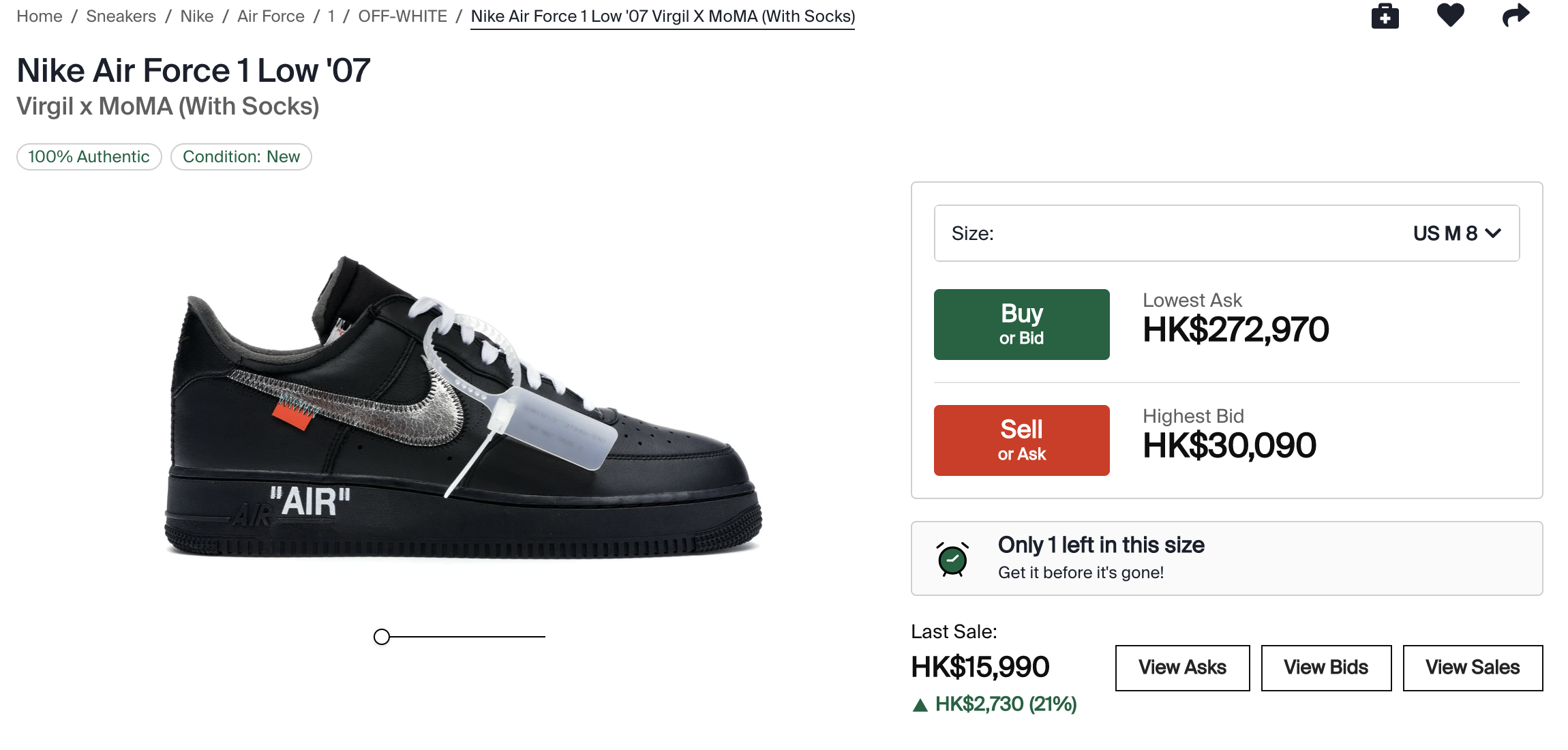真正受到影响的是Off-White的联名系列,其中与耐克以及Air Jordan合作推出的单品的价格波动最为强烈。在二手球鞋转售平台StockX上,Off-White和耐克共同推出的一款黑色Nike Air Force 1 Low '07球鞋在售码数均家超过10万港元(约合8.19万元人民币),其中8码在截至发稿时的售价已达到27万港元(约合22.1万元人民币),而最近一次成交的价格只有1.5万港元(约合1.2万元人民币)。