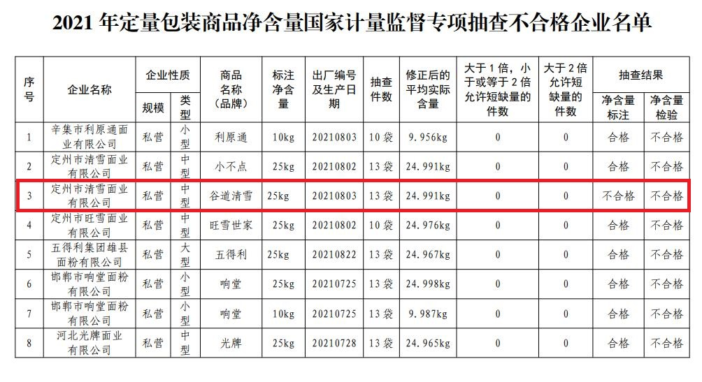 经界面河北梳理发现,在《2021 年定量包装商品净含量国家计量监督专项抽查不合格企业名单》中,定州市清雪面业有限公司生产的商品名称为“谷道清雪”的25kg包装,生产日期20210803,修正后的平均实际含量为24.991kg,抽查结果为两项不合格:一是净含量标注不合格,二是净含量检验不合格。