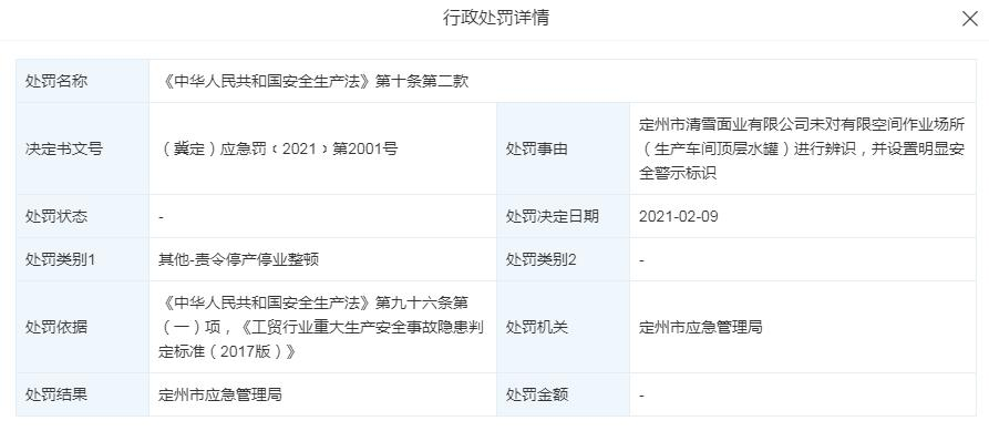 另据公开资料显示,2021年2月9日定州市应急管理局发布行政处罚决定书,文号(冀定)应急罚(2021)第2001号标明:根据《中华人民共和国安全生产法》第十条第二款,定州市清雪面业有限公司未对有限空间作业场所(生产车间顶层水罐)进行辨识,并设置明显安全警示标识,并责令停产停业整顿。