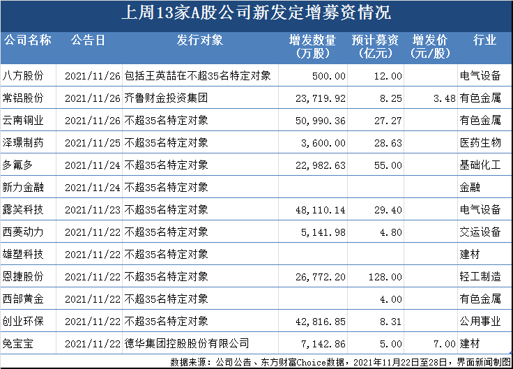上周(11月22日至28日),恩捷股份(002812.SZ)、多氟多(002407.SZ)、露笑科技(002617.SZ)、泽璟制药(688266.SH)、云南铜业(000878.SZ)、八方股份(603489.SH)等13家A股上市公司发布新的定增计划,预计募集资金额合计约为310.65亿元。其中,新力金融(600318.SH)、雄塑科技(300599.SZ)、西部黄金(601069.SH)等为公司重大资产重组进行配套融资。