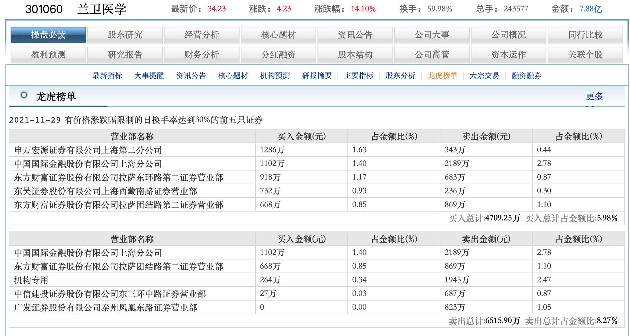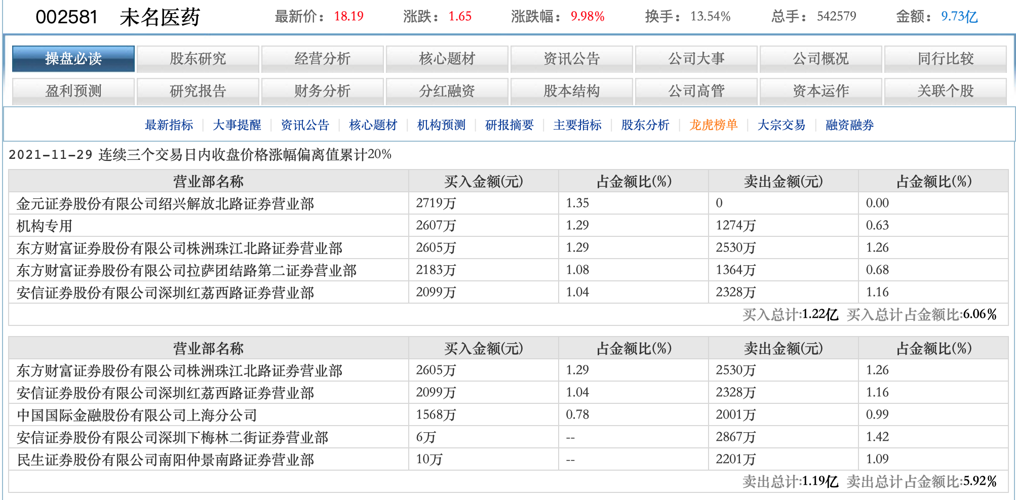 未名医药11月29日因连续三个交易日内收盘价格涨幅偏离值累计20%也荣登龙虎榜(11月25日至11月29日累计涨幅25.45%)。披露显示,三天间同样也有“机构专用”眷顾未名医药,另外,金元证券绍兴解放北路营业部、东方财富证券株洲珠江北路营业部、东方财富证券拉萨团结路第二营业部、安信证券深圳红荔西路营业部跻身买入前五。