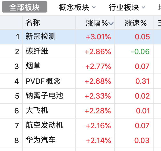 周一,新冠检测板块的涨幅为两市所有板块之首,板块均涨幅达3.01%,板块中的天瑞仪器(300165.SZ)涨幅19.91%,兰卫医学(301060.SZ)涨幅14.1%,硕世生物(688399.SH)涨幅12.91%,之江生物(688317.SH)涨幅也有12.4%,另外美康生物(300439.SZ)以及九安医疗(002432.SZ)的涨幅也都超过了10%。