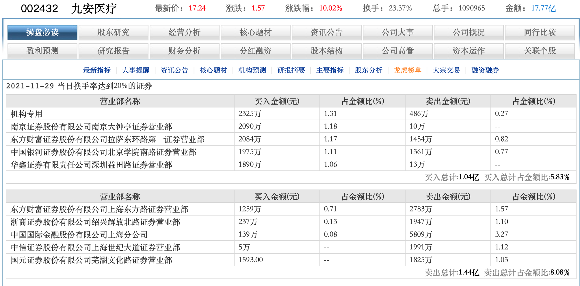 龙虎榜显示,九安医疗11月29日的买入主力有1家“机构专用”,买入金额2325万元,另外南京证券南京大钟亭营业部、东方财富证券拉萨东环路第一营业部、银河证券北京学院南路营业部、华鑫证券深圳益田路营业部等都有上榜。