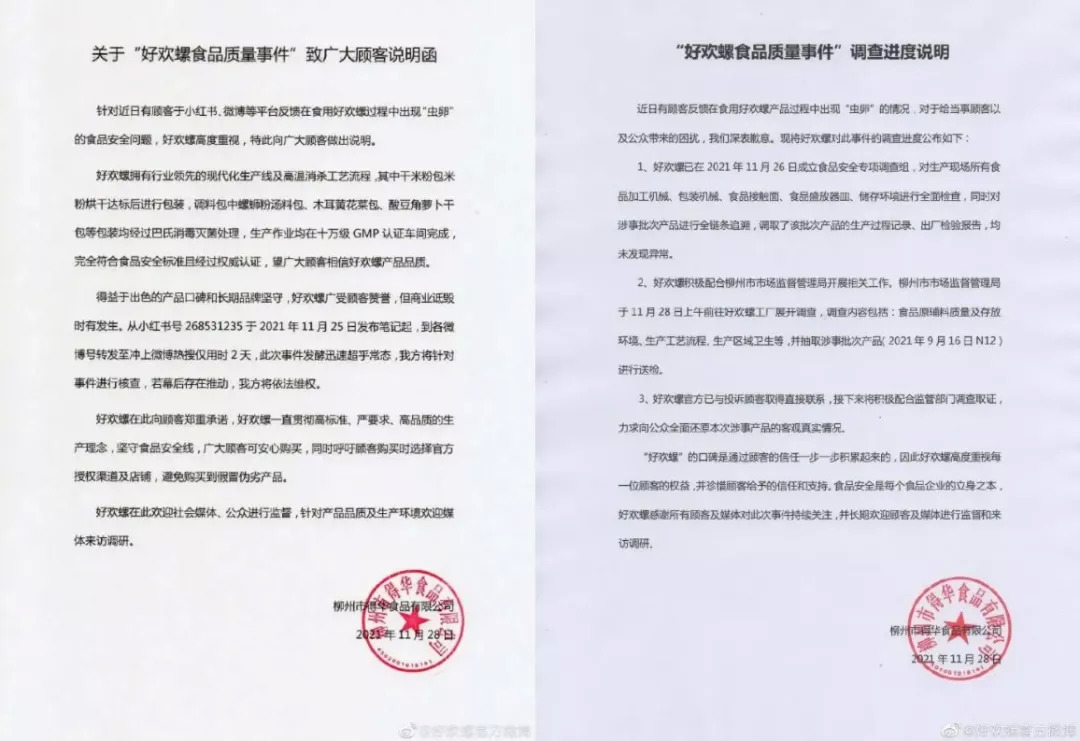 11月28日,“好欢螺 虫卵”“好欢螺回应”登上微博热搜,众多螺蛳粉爱好者纷纷表示,“吓得头皮发麻”“手里的螺蛳粉顿时不香了”“突然戒掉了螺蛳粉”。