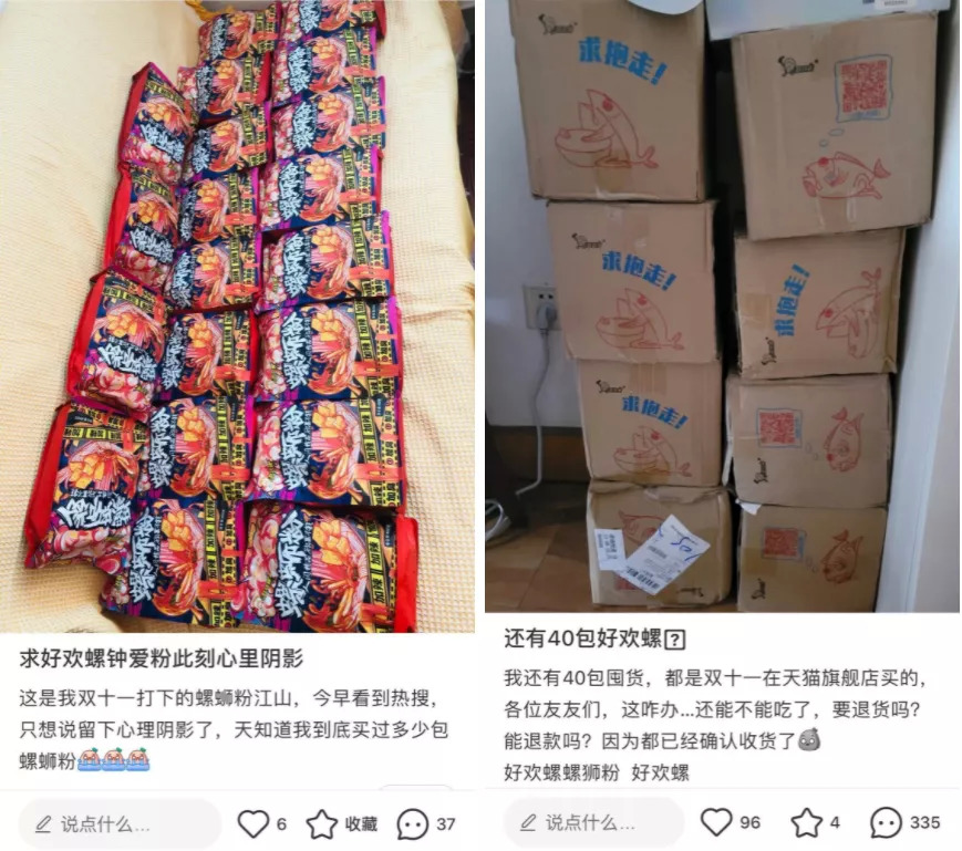 刚过去不久的双11,不少螺蛳粉爱好者们都进行了“补货”,如今“好欢螺”被曝吃出虫卵,比指责品牌商家更麻烦的是,如何处理囤货。有博主称,家里还有40包好欢螺,但已经确认收货,不知道是否能退款。