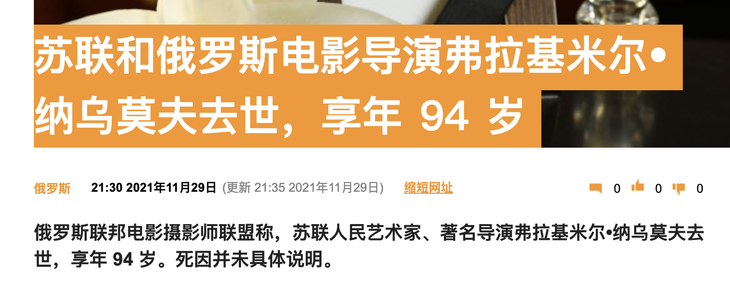 据俄罗斯卫星通讯社11月29日报道,俄罗斯联邦电影摄影师联盟称,苏联人民艺术家、著名导演弗拉基米尔·纳乌莫夫去世,享年94岁。死因未具体说明。