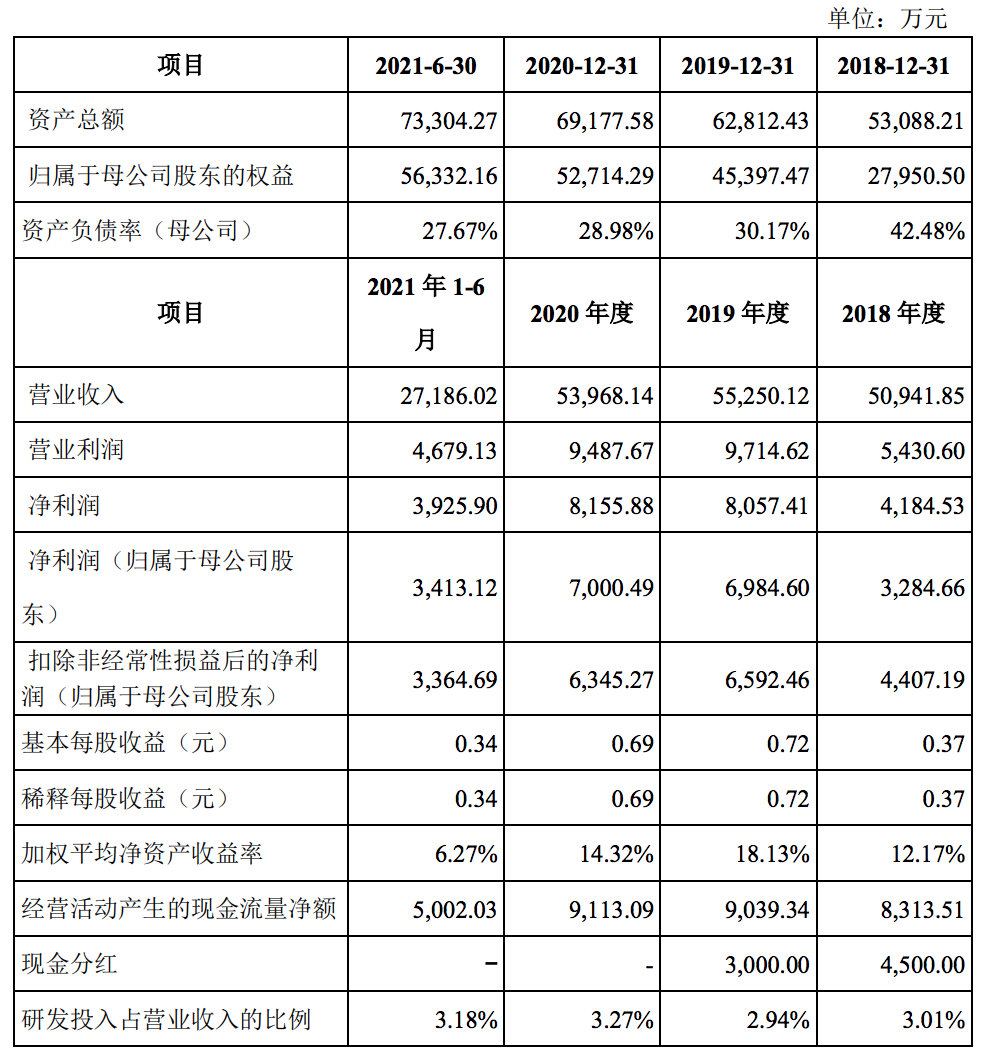 招股书显示,2018年、2019年和2020年,明月镜片的营收分别为5.09亿元、5.53亿元、5.40亿元,其中2020年略有减少;归母净利润分别为3284.66万元、6984.60万元、7000.49万元,期内均实现了增长。