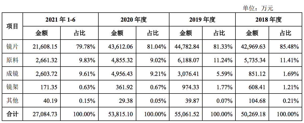 按产品类型来看,明月眼镜的收入主要由镜片贡献,占比约在八成上下。2018年、2019年、2020年和2021年上半年,该类收入分别为4.30亿元、4.48亿元、4.36亿元和2.16亿元,对应的占比分别为85.48%、81.33%、81.04%和79.78%。