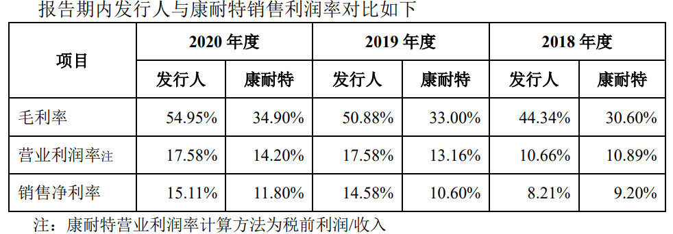 报告期内,明月镜片的毛利率、营业利润率和销售净利率均高于康耐特,主要由于发行人以销售自有品牌产品为主;而康耐特自有品牌占比较低,以OEM/ODM为主。