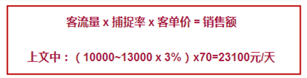 在选址上,我们要明确,首先考虑的是人流量,举例:如你的保本点在1万,你门前通过测人流量得到的数据,客流量每天在10000~13000之间,按照全天3%的捕捉率算出实际到店人数是全天330人左右,乘以客单价70元,平均23100元/天收入当然周末可能更高。有这样的数据支撑,才能判断我是否能在这开店,是否这样的一个门前人流量能确保我盈利。